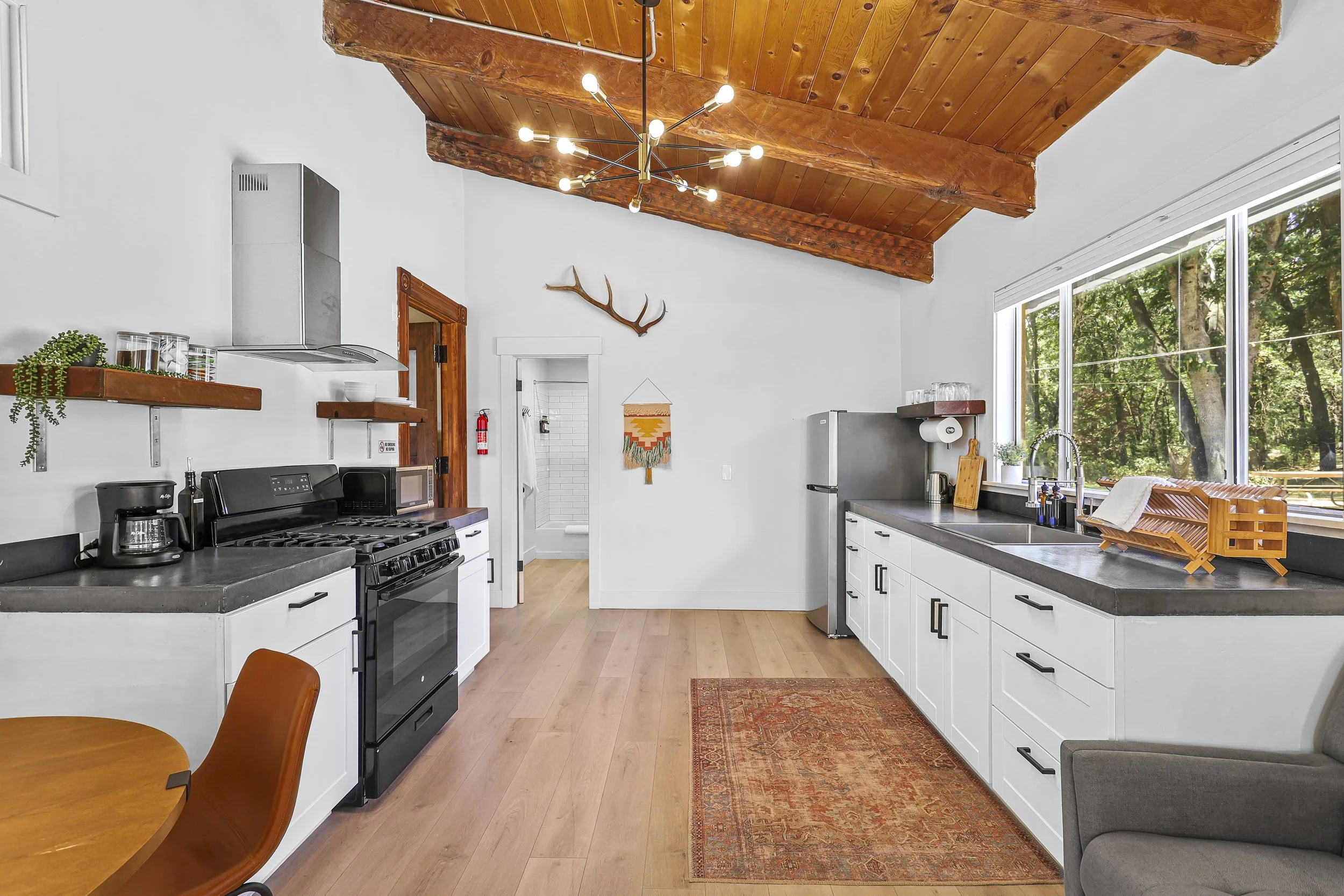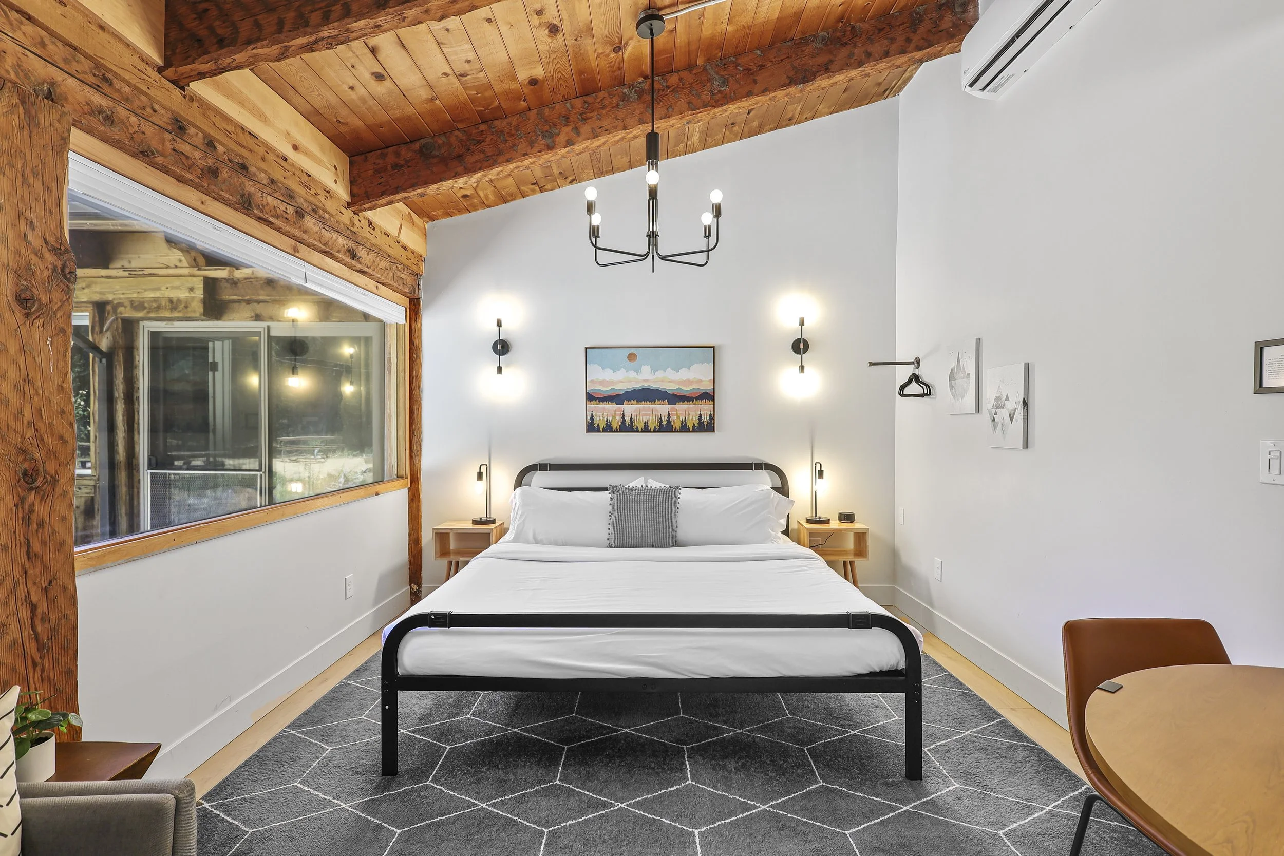 This remodeled studio cabin is spacious, open, and naturally lit with large windows! Mountain modern finishings with new kitchen and bathroom, new lighting, paint and furnishings throughout while maintaining the rustic beauty of this cedar lodge. Includes brand new super comfy King bed and 4k HD TV! Lightning fast WiFi with 500 mb speeds and off street parking is included.