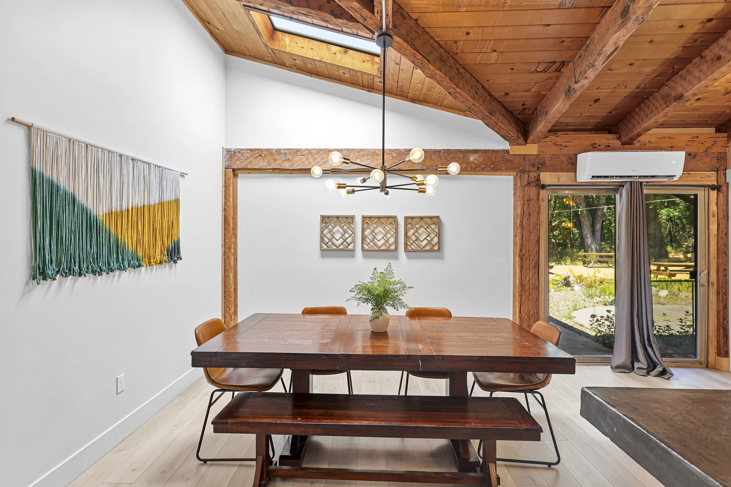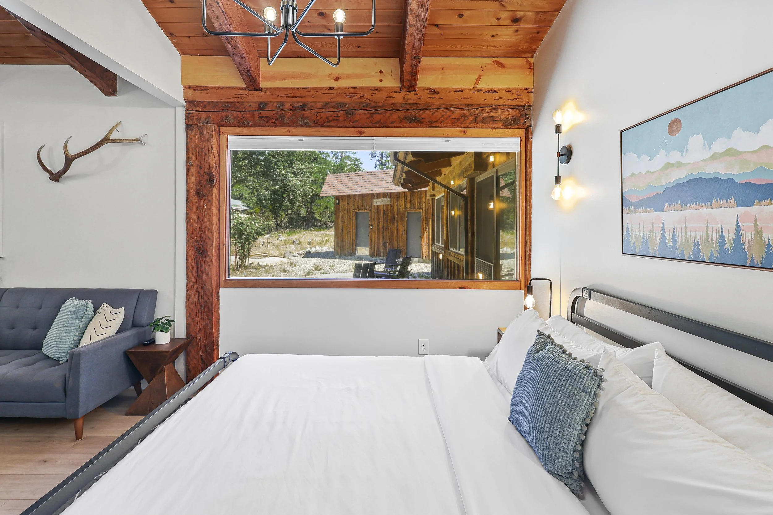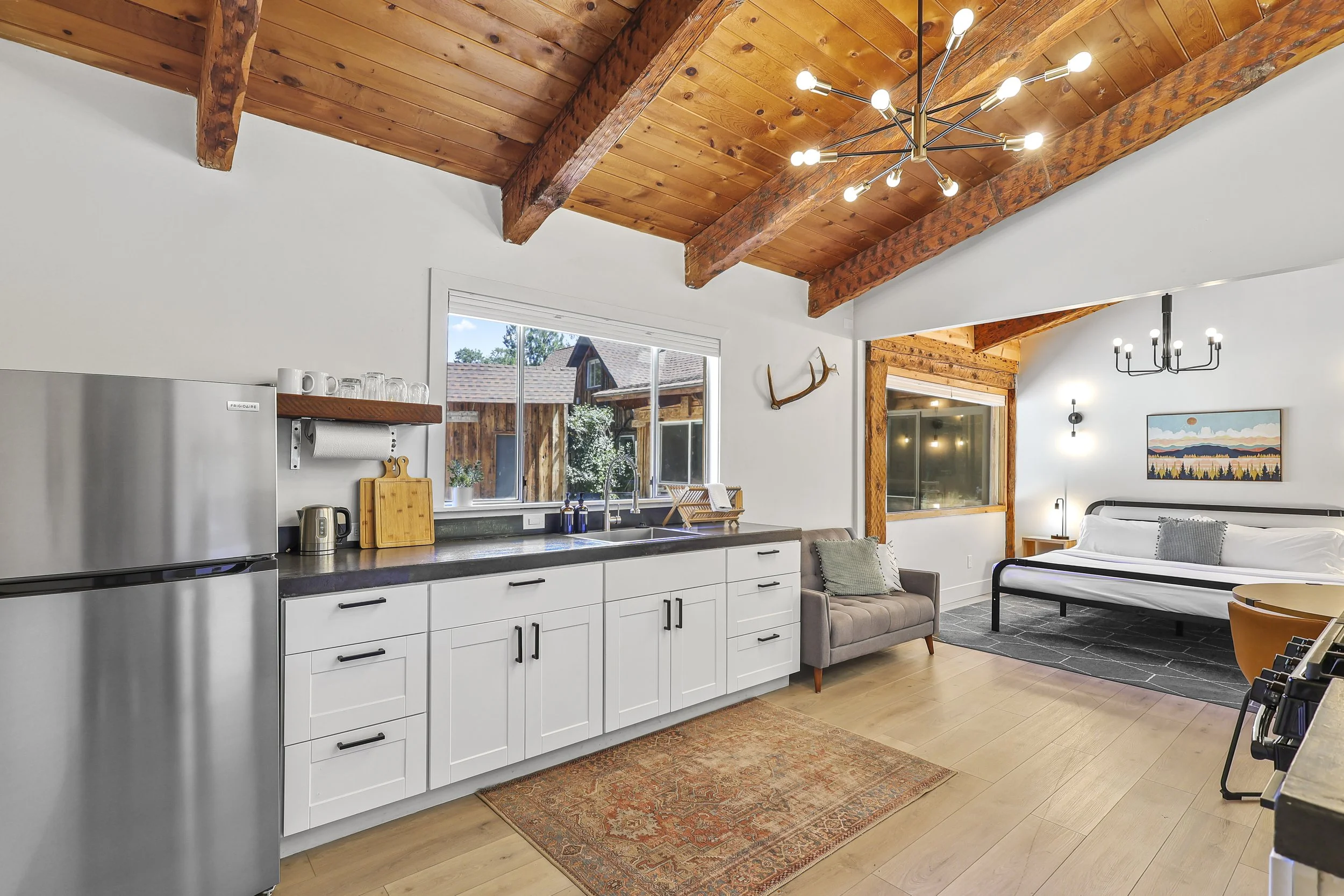 Head outside to the Adirondack chairs and hammocks to relax, sip your coffee and watch the sunrise over Mt Shasta or gaze at the stars. Eat a meal on one of the picnic tables or play a game on the corn hole set. The backyard is lit with cafe string lights and wall sconces.