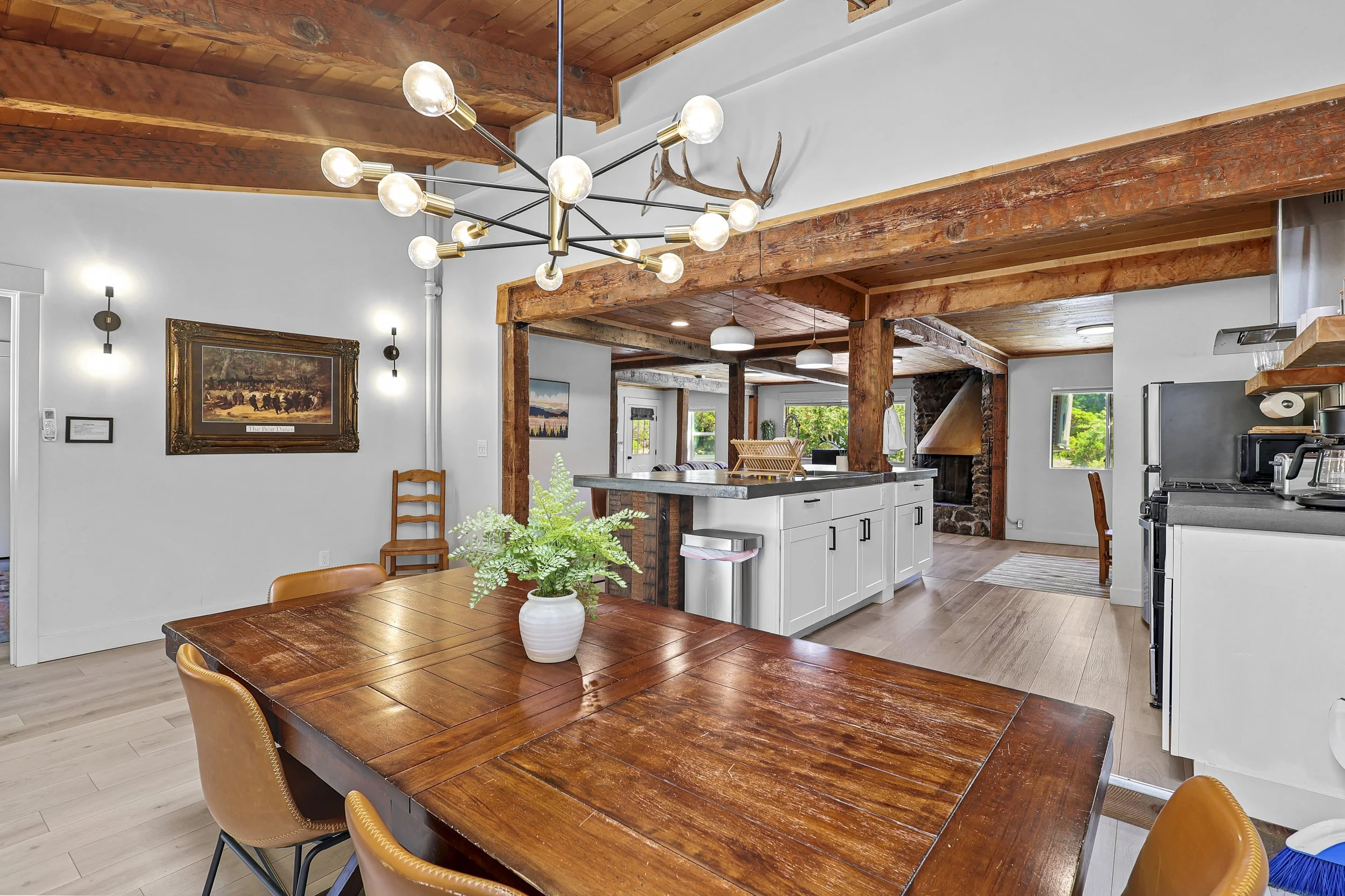 -3 fireplaces in the lodge, including 2 custom-built hearths by a local artisan, and a wood-burning stove.